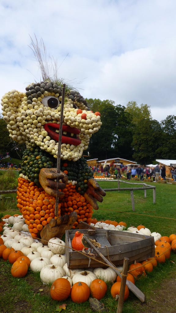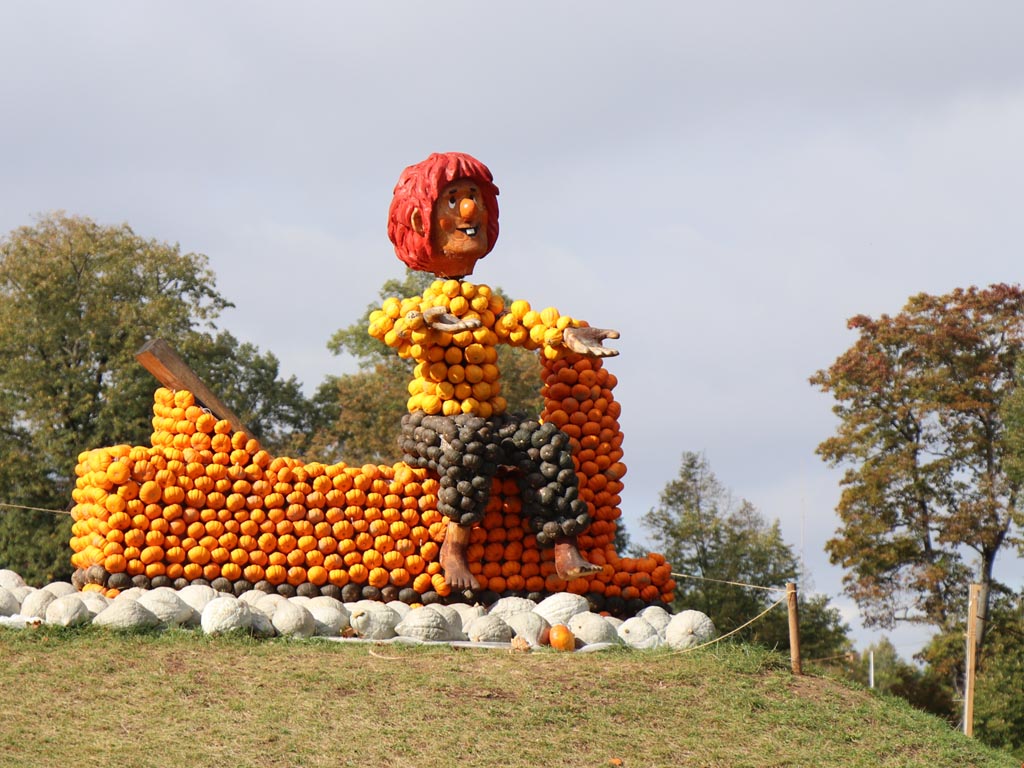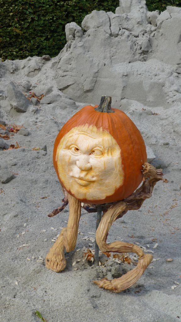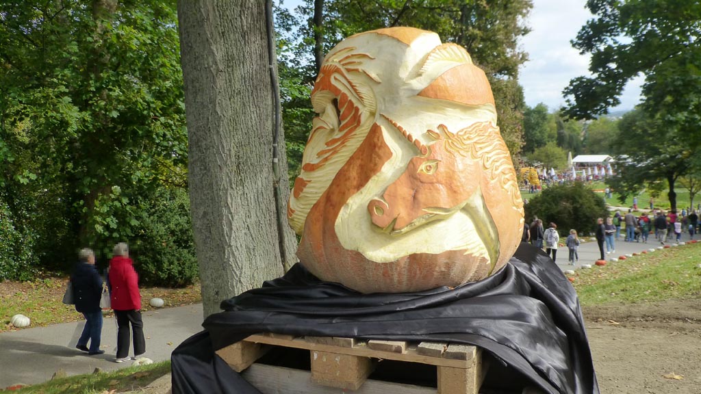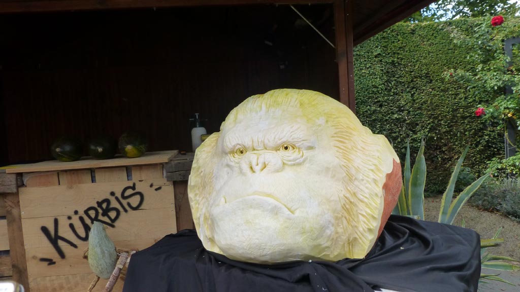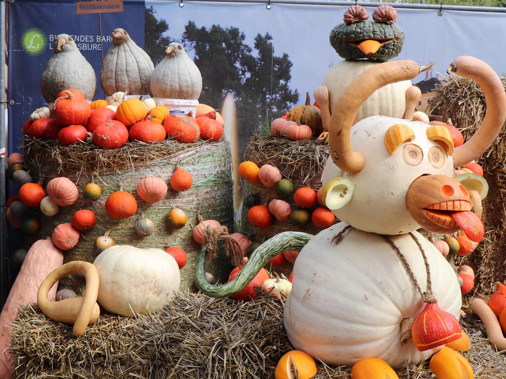 Besonders schön anzusehen waren die vielen teils sehr großen Figuren, die aus den verschiedensten Kürbissorten zusammengesetzt waren. Aber auch einzelne kleinere und größere Kürbisse, die kunstvoll zu recht „geschnitzt“ waren begeisterten die Besucher mit ihren Grimassen und regten die Phantasie zu allerlei Interpretationen an.