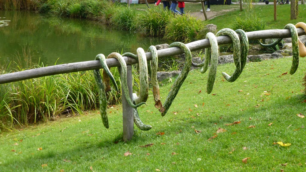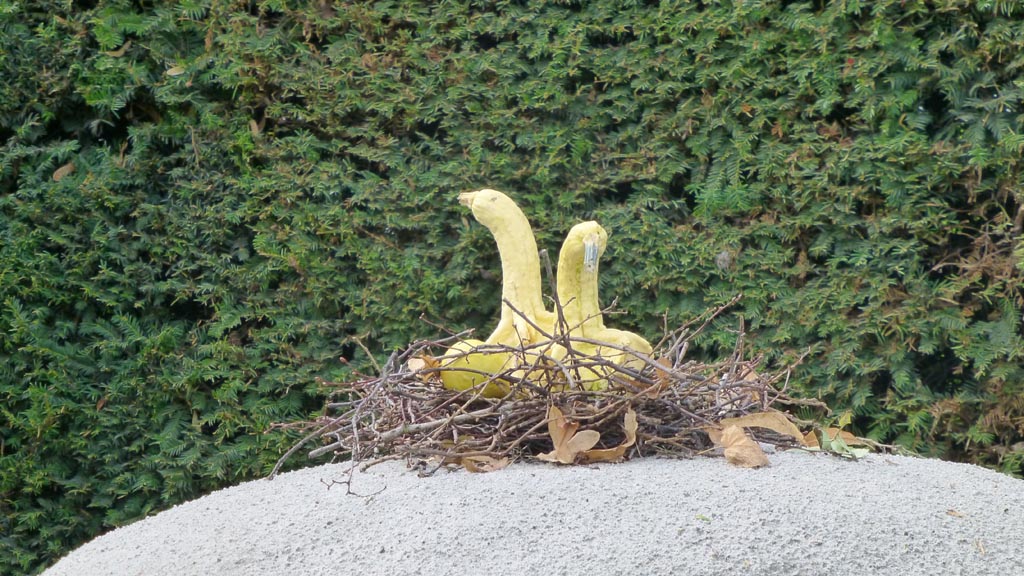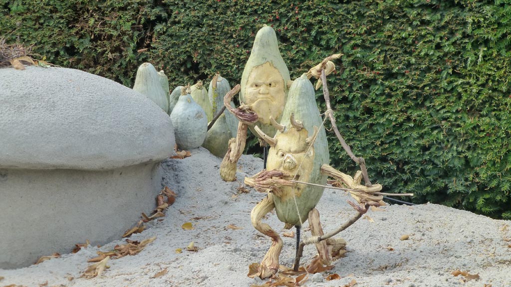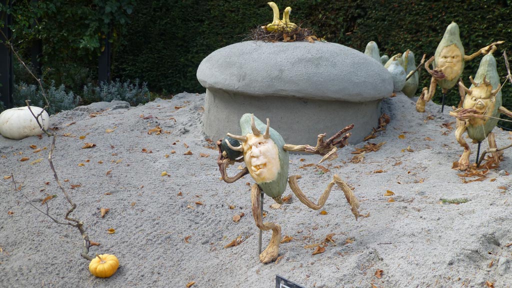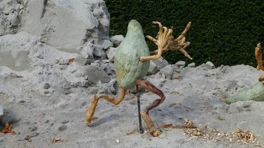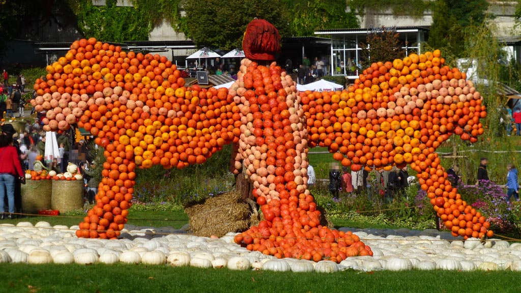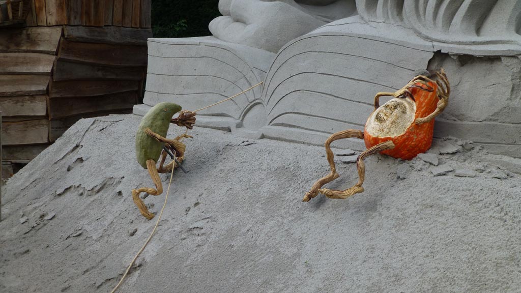 Besonders schön anzusehen waren die vielen teils sehr großen Figuren, die aus den verschiedensten Kürbissorten zusammengesetzt waren. Aber auch einzelne kleinere und größere Kürbisse, die kunstvoll zu recht „geschnitzt“ waren begeisterten die Besucher mit ihren Grimassen und regten die Phantasie zu allerlei Interpretationen an.