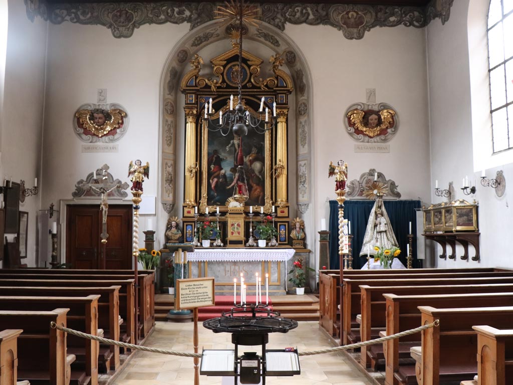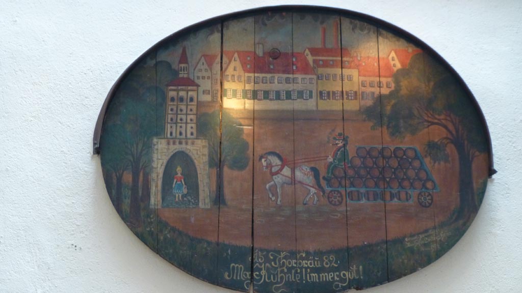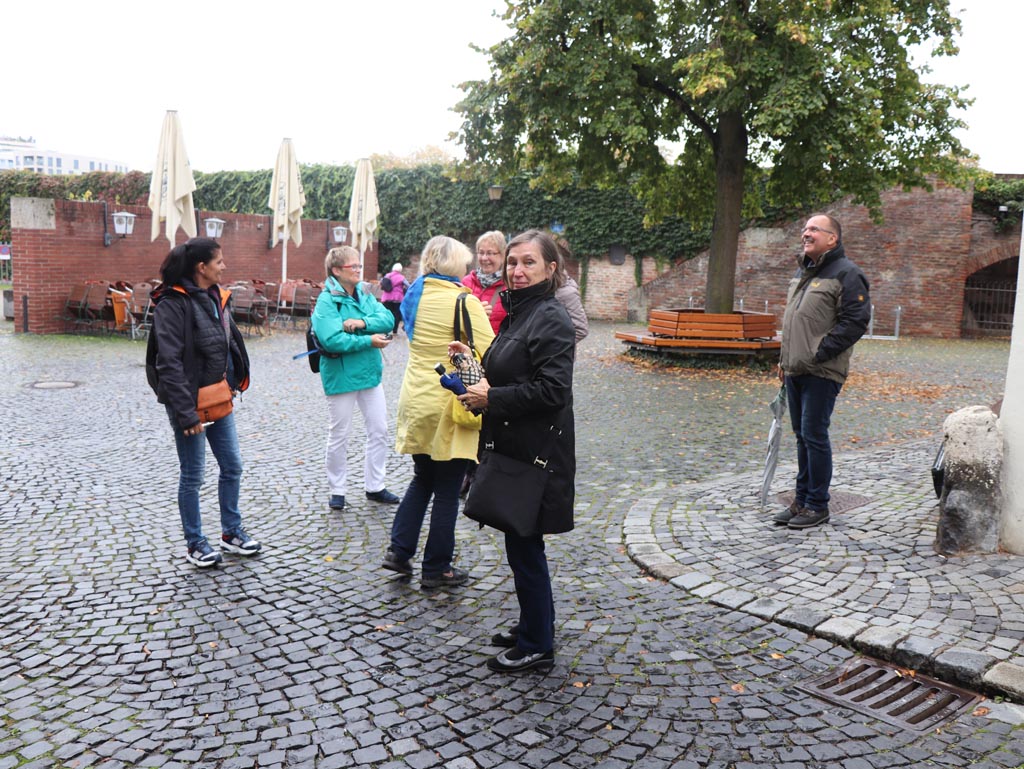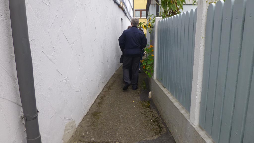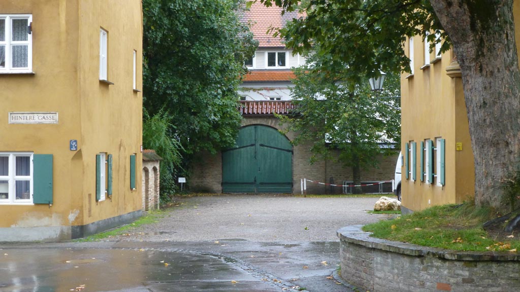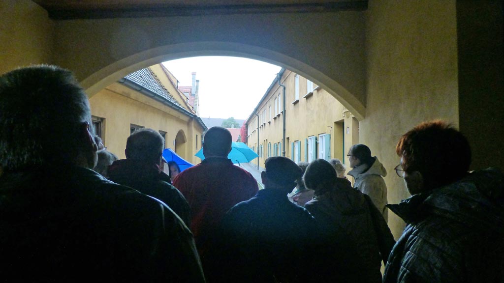 Mit unserer Gästeführerin, und mit Regenschirm ausgestattet, erkundeten wir das Gelände und erhielten Einblick in verschiedene Bereiche. Aktuell leben ca. 150 bedürfte Augsburger Bürger in der Fuggerei. Die Wohnungen werden von den Bewohnern selbst eingerichtet, je nach Bedürftigkeit gibt es Zuschüsse durch die Stadt Augsburg. Auch die Nebenkosten zahlen die Bewohner selbst. Augenzwinkern erfuhren wir dann noch, dass es keine Kontrolle darüber gibt, ob die drei im Mietvertrag festgelegten Gebete auch täglich gesprochen werden.