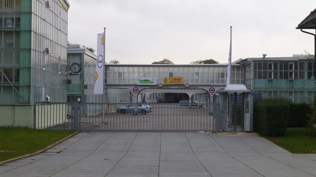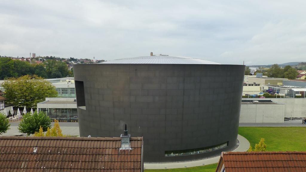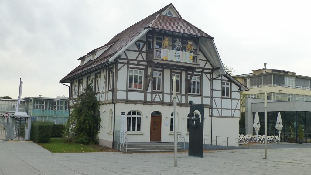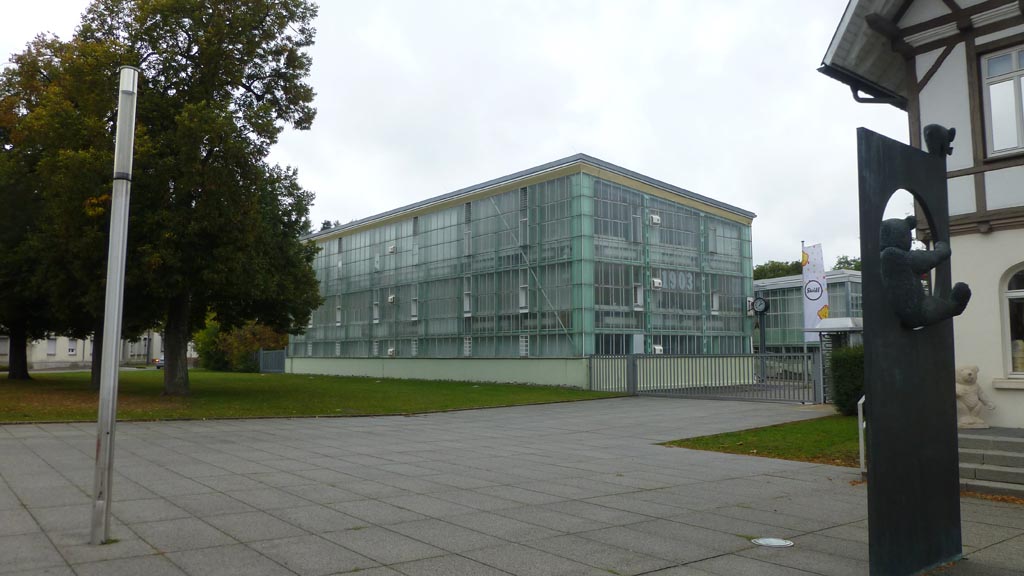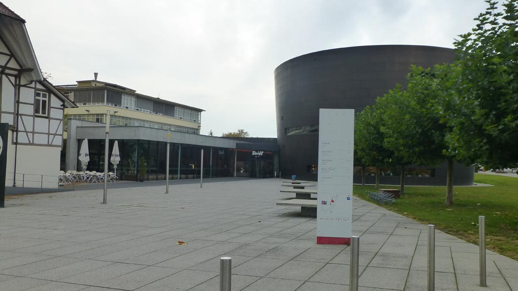 Von einer Anhöhe war der Blick frei auf das Steiff-Gelände mit seinen Fabrikhallen, dem Fachwerkhaus und dem modernen Steiff-Museum mit seiner runden Form. Der Blick auf das Museum von diesem Standpunkt aus war bewusst gewählt, weil von oben erkennbar ist, dass das Dach des Museums einem Knopf nachempfunden ist. Bekanntlich ist der Knopf ja das Markenzeichen der Firma Steiff.