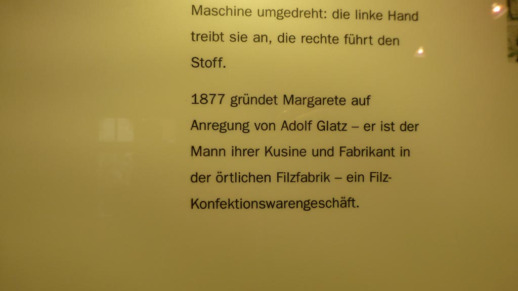 Viele weitere Details über Margarete und ihren Werdegang kann man im Internet nachlesen, über Wilhelm Adolf Glatz jedoch findet sich sehr wenig. Lediglich der Hinweis, dass er ihr den Rat gab, sich selbstständig zu machen, wird genannt. Hier waren weitere Ausführungen unserer Gästeführerin, die uns durch das Geburtshaus führte, interessant. Wir erfuhren, dass er Margarete mit Filzstoffen aus der Filzfabrik, die sich am Rande von Giengen befand und in der er Direktor war, belieferte.