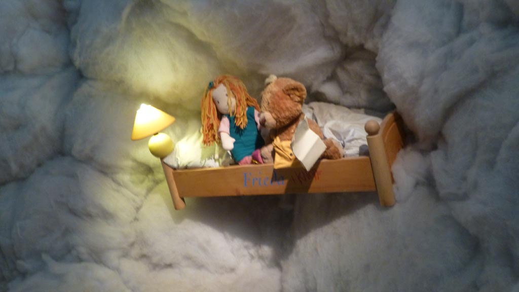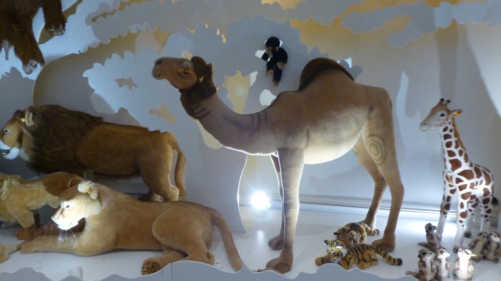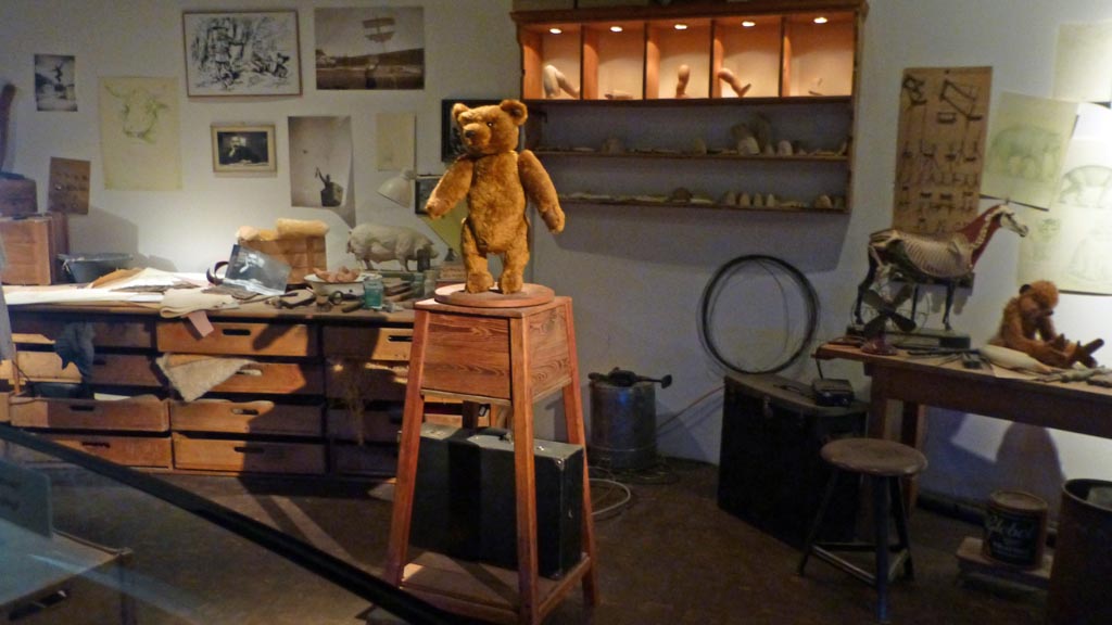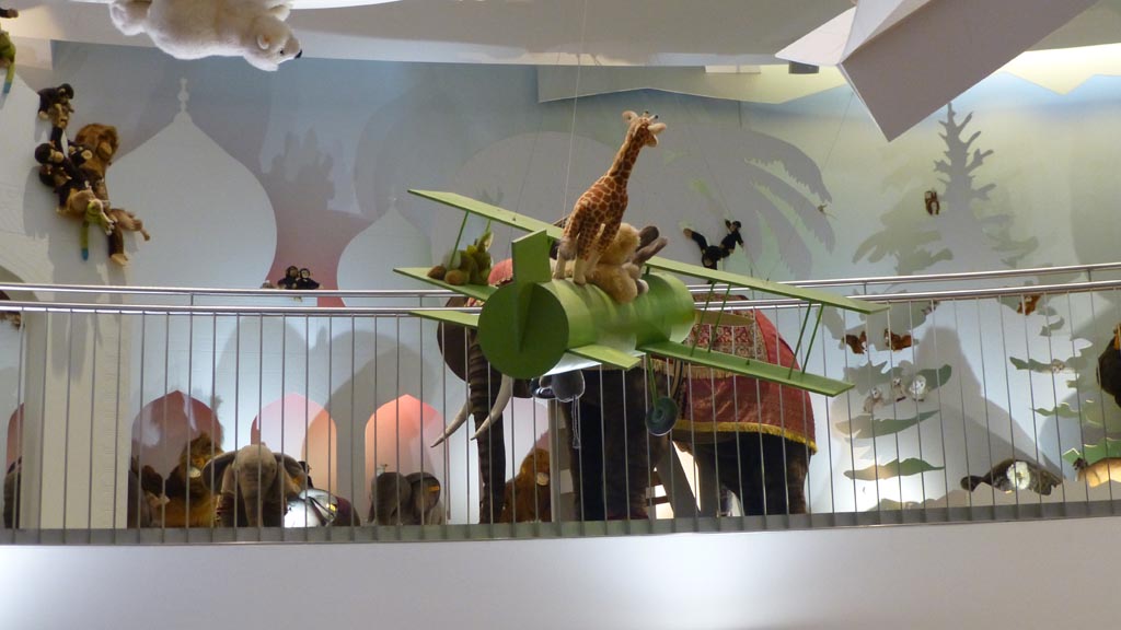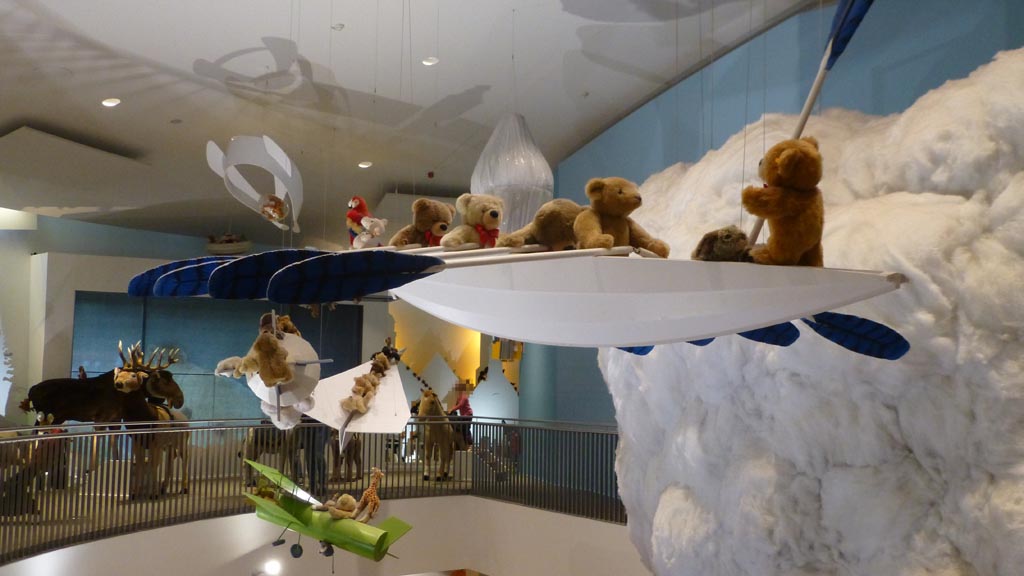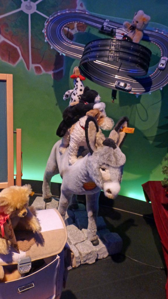 Sehr gelungen werden hier Exponate aus allen Epochen der Steiff-Produktion gezeigt und auf teils lebensgroßen Tierfiguren dürfen sich die Kinder nach Herzenslust austoben.