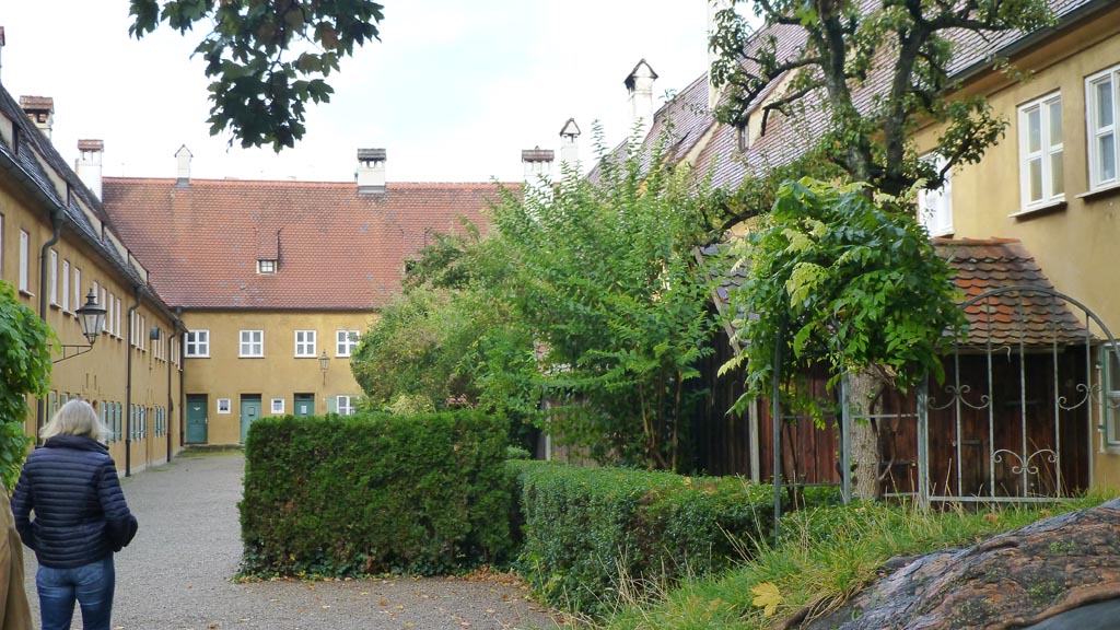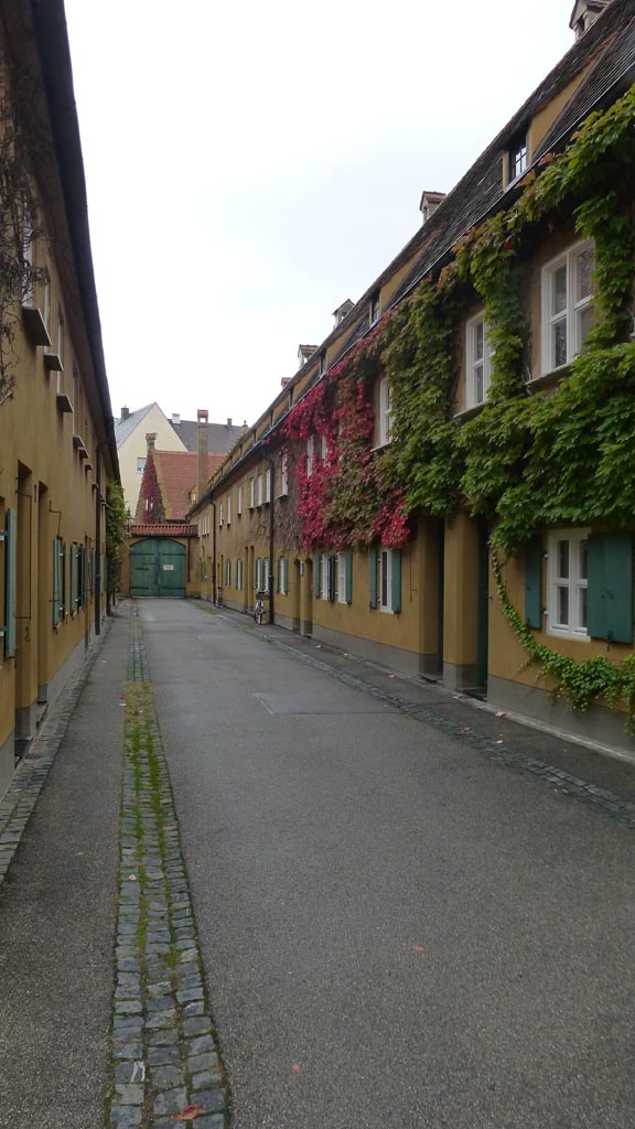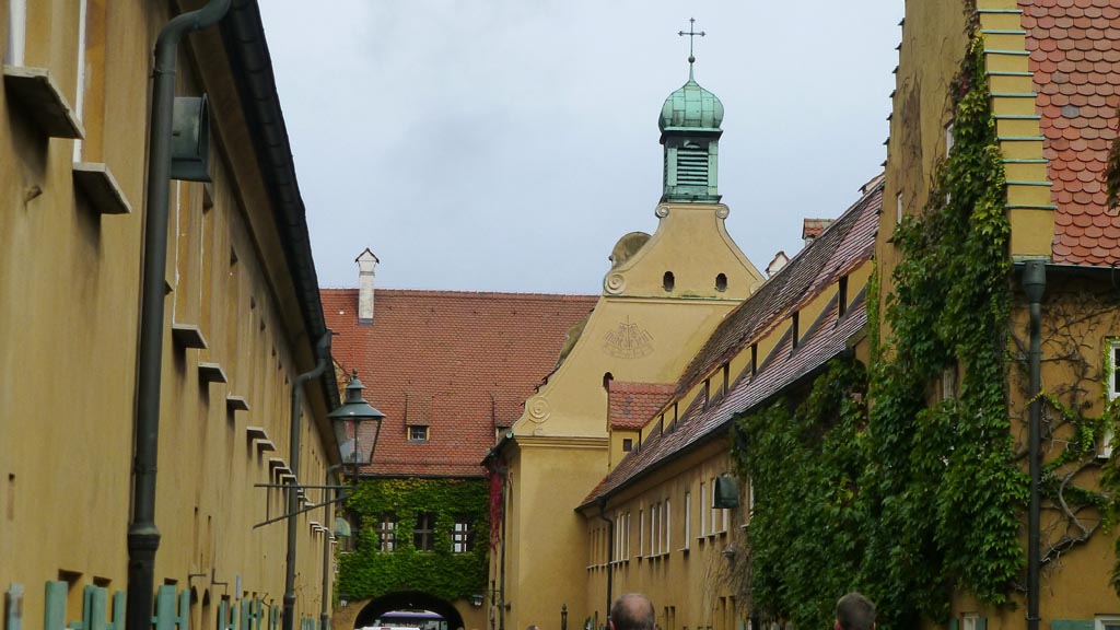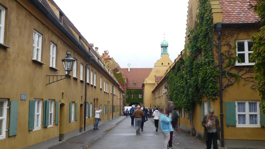Die Fuggerei ist eine kleine Stadt in der Stadt mit 67 Häusern in denen sich 142 Wohnungen befinden, rundum umgeben von einer Stadtmauer. Es gibt drei Stadttore, die alle nachts geschlossen werden. Für verspätet heimkehrende Bewohner befindet sich an einem der Tore eine Klingel.