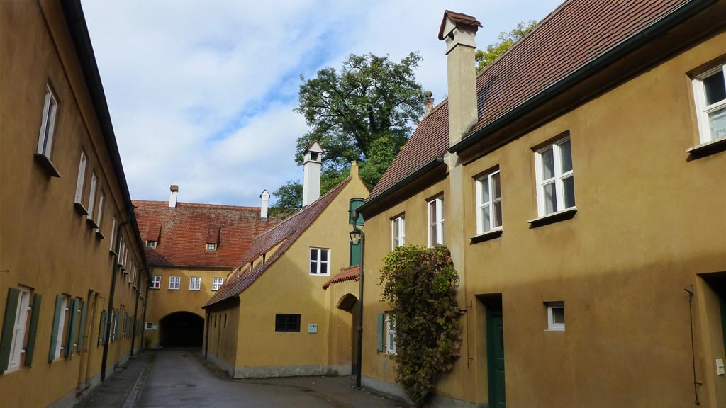 Ab dem Jahr 1514 bis 1523 ließ Jakob Fugger diese Siedlung für schuldlos verarmte Augsburger Bürger erbauen und stiftete sie im Jahre 1521. Bis heute wohnen hier sozial bedürftige Menschen zu den Konditionen, die Jakob Fugger seinerzeit verfügt hat und die sich im Mietvertrag wiederfinden: Der Mieter muss katholisch sein und täglich drei Gebete sprechen. Die Jahreskaltmiete beträgt auch heute noch den Gegenwert eines Rheinischen Guldens, was einem Betrag von 0,88 € entspricht.