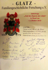 Der stattliche Baum mir Gedenktafel erinnert an unseren Urahn Blasius Glatz der dort geboren war und von dem aus unsere Forschung begann.