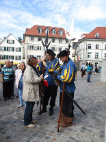Dort erwartete und eine Stadtführung der besonderen Art: Mit dem Landknecht „Die Sau rauslassen“, ein Rundgang durch die Innenstadt mit vielen Anekdoten und Redewendungen, die von den Verfassern eines Konstanz-Buches mit Witz und Sachkenntnis vorgetragen und von und begeistert aufgenommen wurden.